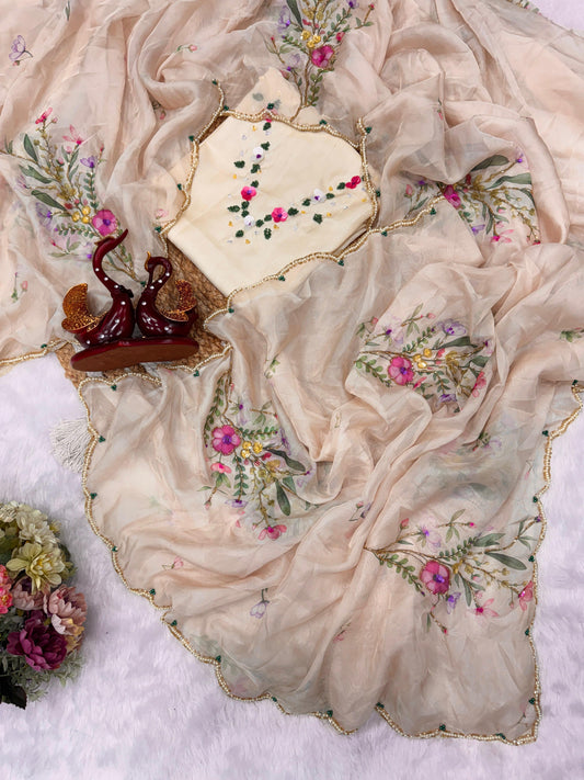 Premium Soft Organza Digital Print Saree with Moti, Aarka & Kardana Handwork