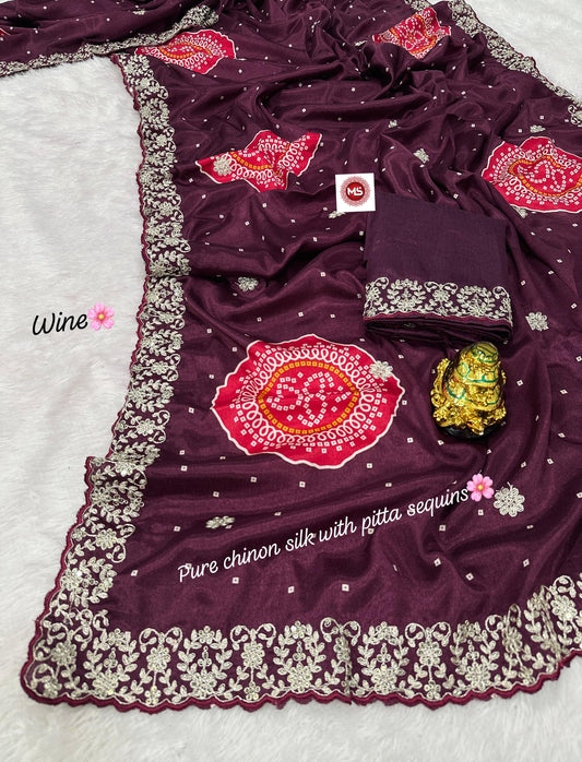 Pure Chinon c-pallu with pitta Codding and sequins work in all saree