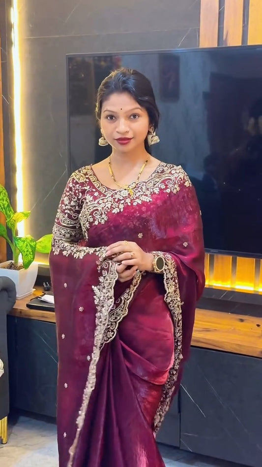 Luxe Fendy Satin Saree with 3mm Sequin Embroidery & Heavy Border