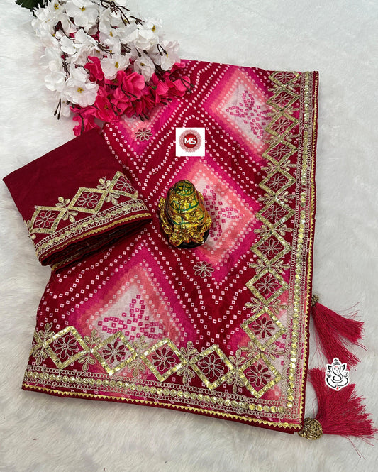 Heavy Digital Chinon Silk Bandhej Saree with Thread–Gottapati Work