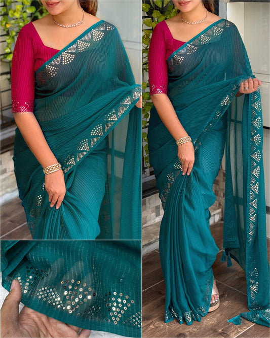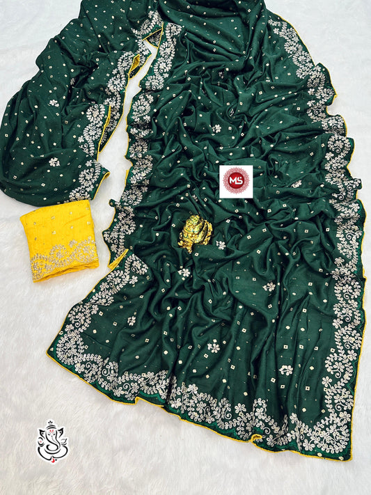 Moss Chiffon Saree with Siroski Sequence Border & Embroidery Blouse