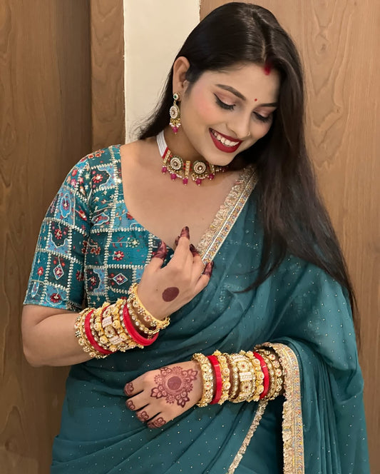 Soft Star Georgette Saree with Jarkan Dot Work & Multicolour Lace