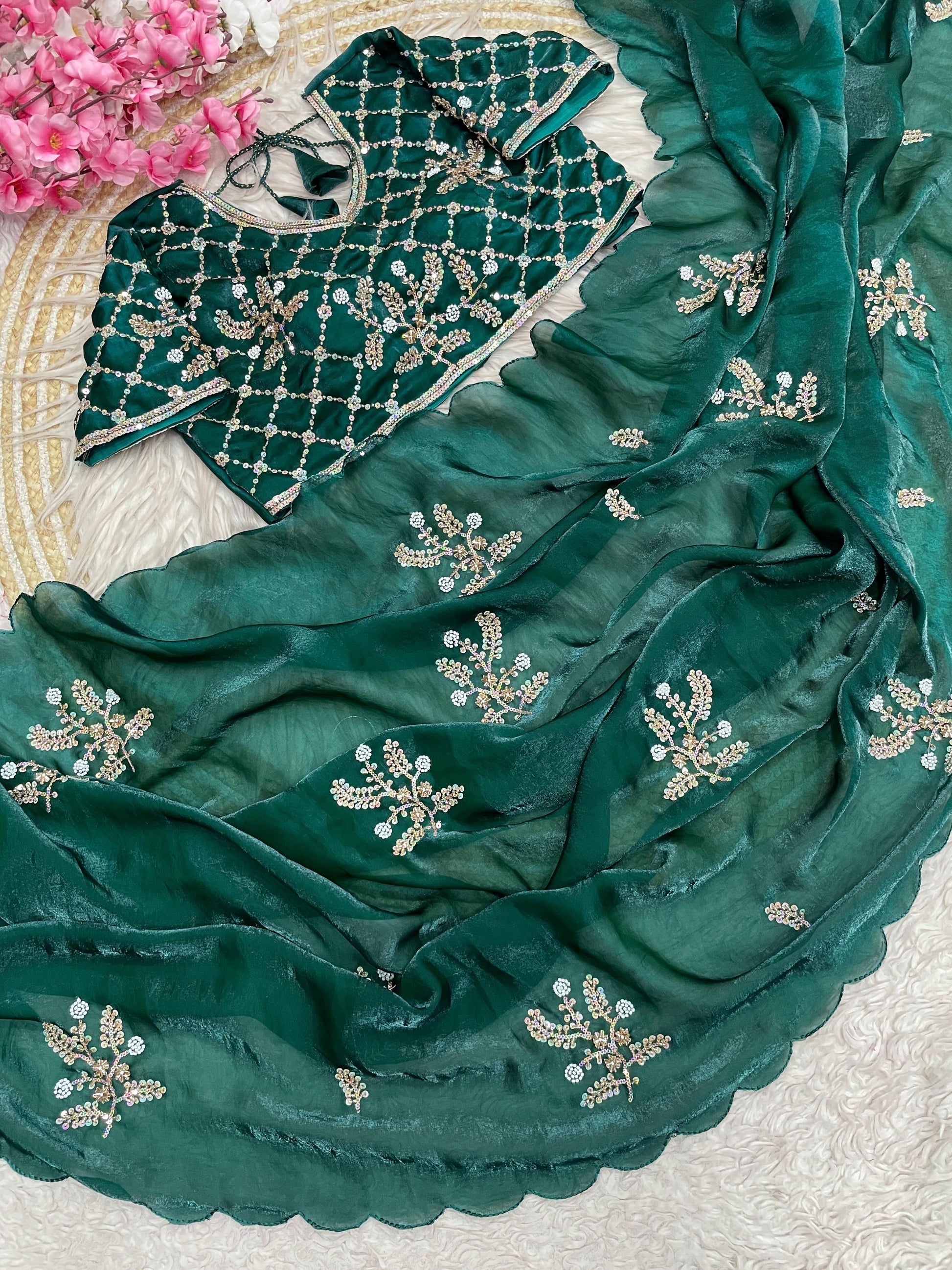This Fandy Satin saree is built for women who want a sleek, modern, and premium look without losing elegance. The fabric has a smooth, glossy finish that drapes effortlessly and enhances the body's natural silhouette.