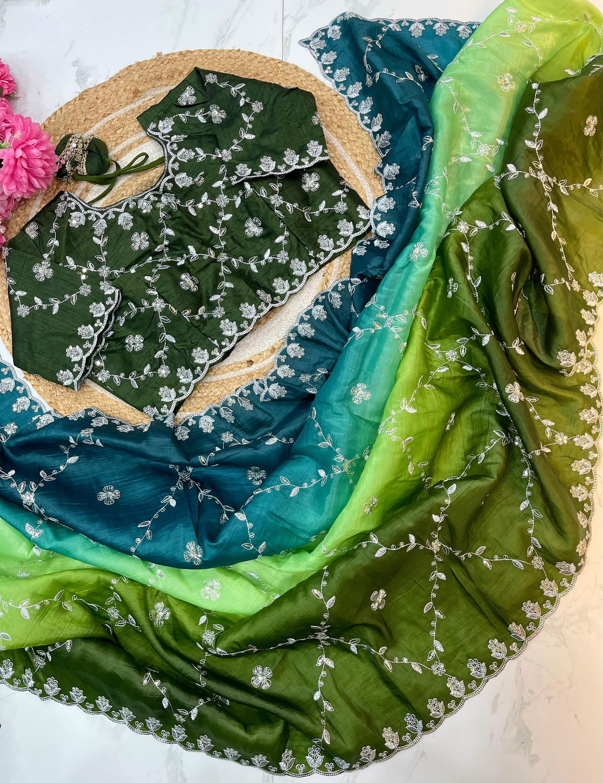 Paired with a fully stitched designer blouse crafted from pure raw silk fabric, highlighted with intricate embroidery and fancy tassels, adding a touch of high-end couture styling. Designed to fit comfortably up to 42", ensuring both elegance and ease.
