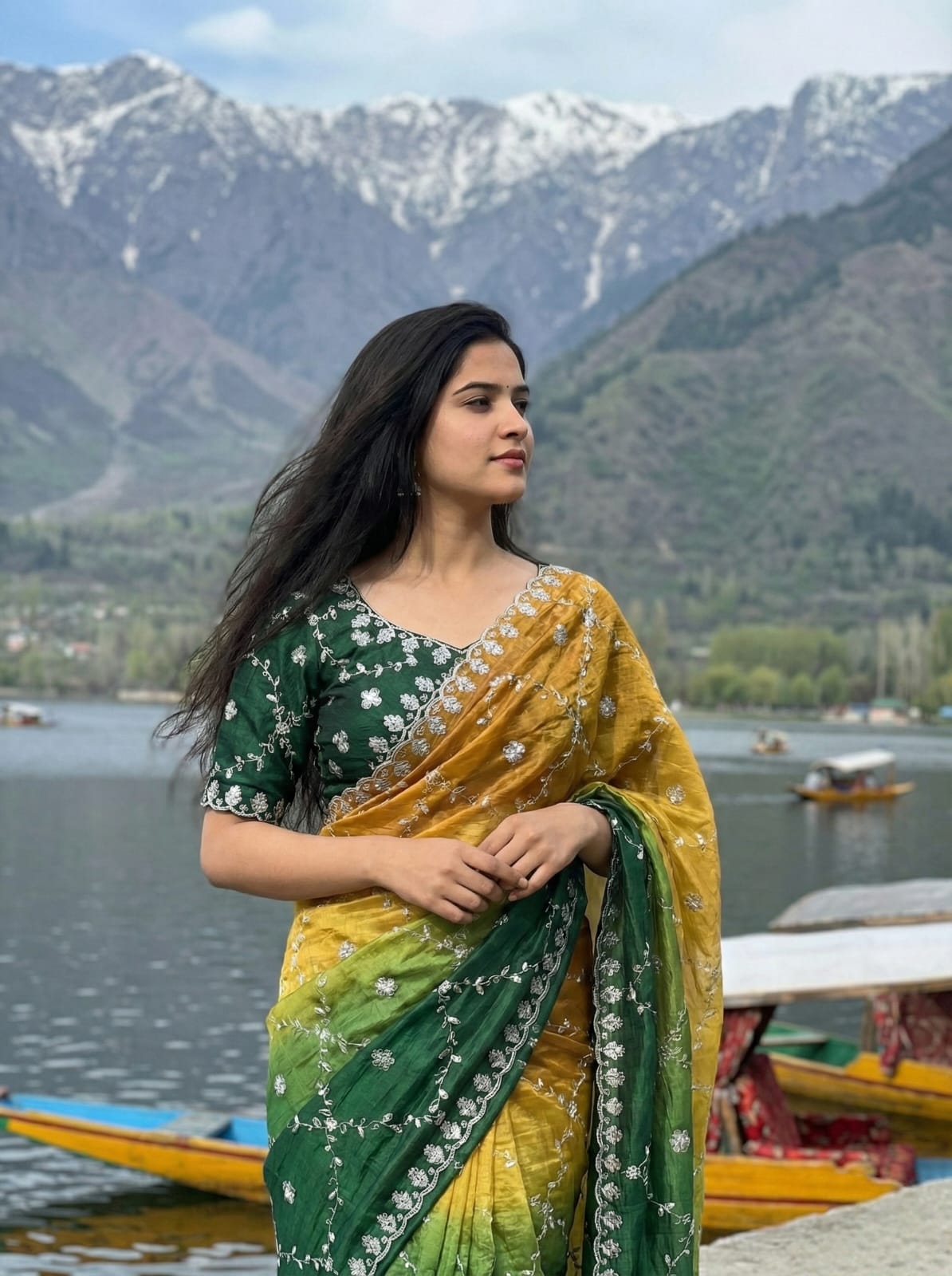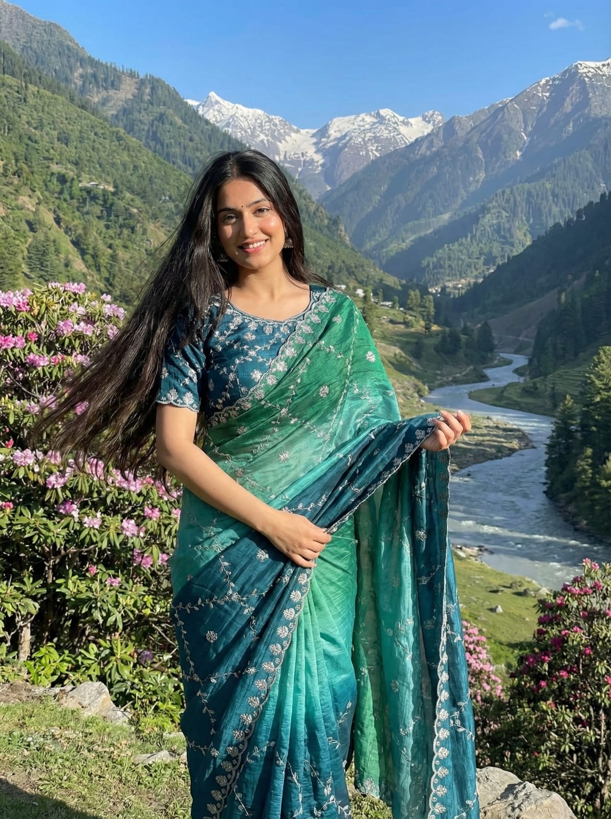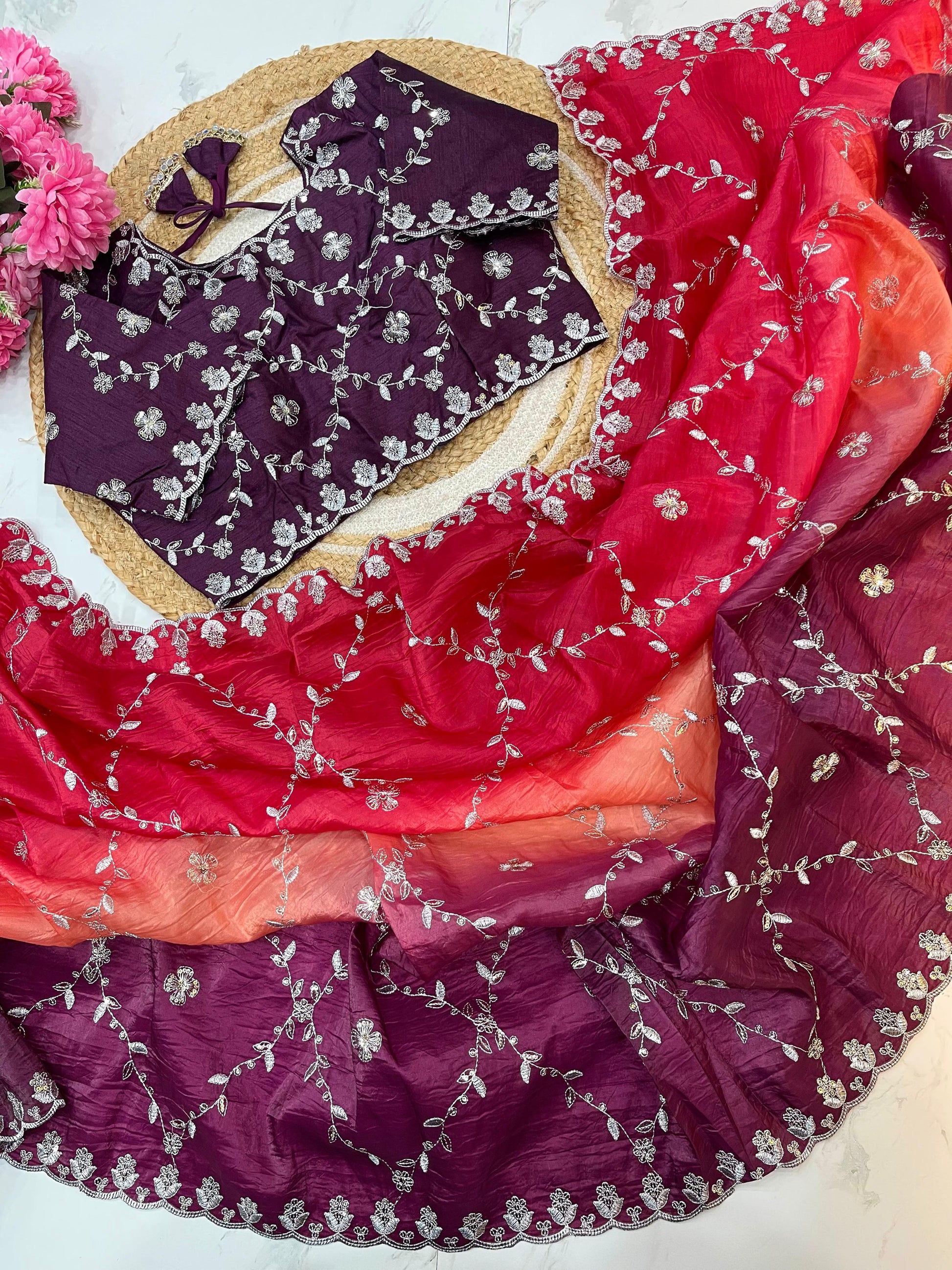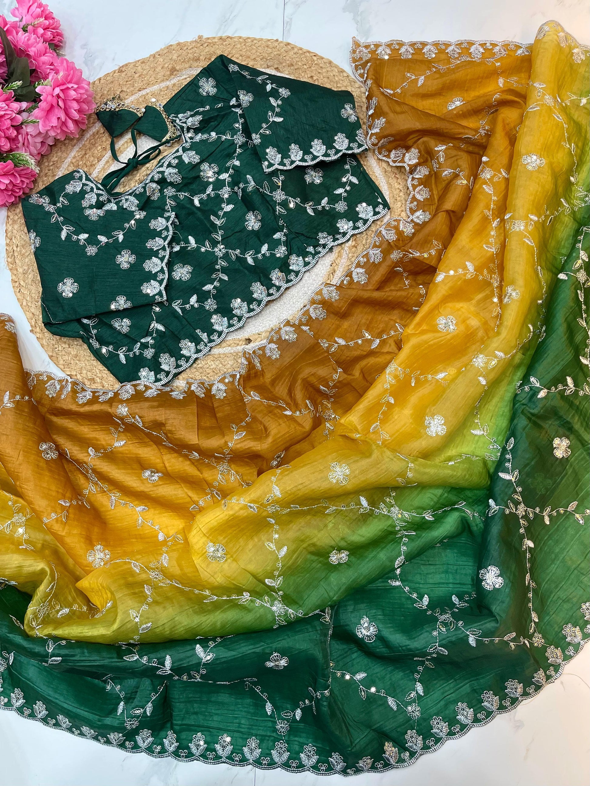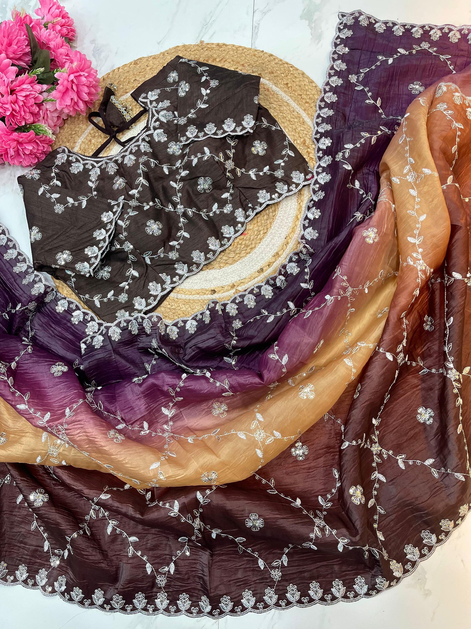 This saree is made from very soft and elegant Gold Crush Pedding fabric, giving a rich, luminous drape that looks luxurious from every angle. It features beautiful embroidery with fine 3 mm sequence work, enhanced with jhal detailing and an elegant Aarco border, spread gracefully all over the saree for a perfectly balanced, premium finish.