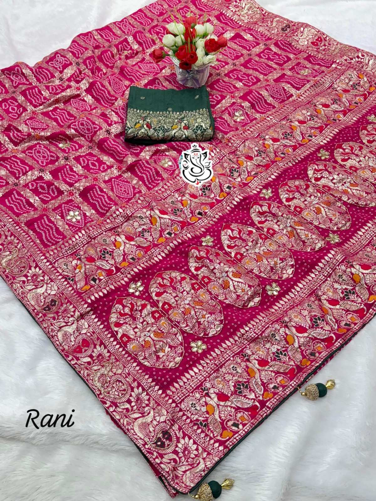 This fabric-soft Dola Silk saree is crafted with rich weaving zari work, giving it a royal, high-class look. The saree features hand-done moti & pipin detailing, finished with gota work butis that add depth and elegance. The heavy-style tassels on the pallu border elevate the saree’s overall aesthetic, making it perfect for weddings, functions, and premium occasions.